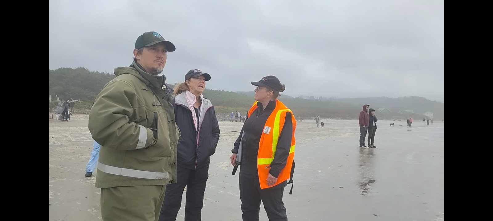 The first officials arrived that morning: Lisa Balance from the Marine Mammal Institute, a network member "Jane," and two state park employees. They immediately moved the public back 50 yards, warning that crossing the tape meant arrest. Lisa Balance told the crowd, “People want to help the whale, and the truth is there is nothing we can do for the whale. Best thing we can do is to stay away from it, to stay back.” Network member Carrie Newell arrived later.